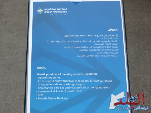 برعاية معالي محافظ البنك المركزي الدكتور زياد فريز وبحضور رئيس مجلس ادارة البنك الاردني الكويتي دولة عبدالكريم الكباريتي وعددا من الوزراء والمدعوين احتفل البنك الاردني الكويتي ظهر اليوم الاربعاء 2/3/2016 بافتتاح الفرع " الجوال " الذي اطلقه البنك ايمانا للوصول الى كافة شرائح المجتمع افي جميع مناطق المملكة وتأكيدا لشعار البنك "اكثر من بنك" وتجسيدا في ان يكون البنك رائد في تقديم الخدمة المصرفية الشاملة فيما يواكب اخر مستجدات الصناعة المصرفية والتجارة الالكترونية في العالم.