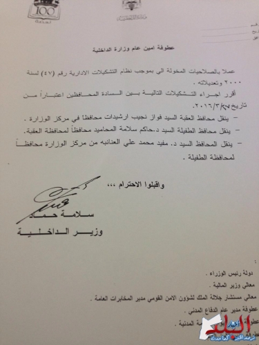 قرر وزير الداخلية سلامة حماد اجراء تنقلات محدودة طالت 3 مراكز محافظين، حيث ينقل محافظ العقبة السيد فواز نجيب ارشيدات محافظا في مركز الوزارة. وينقل محافظ الطفيلة السيد د. حاكم سلامة المحاميد محافظا لمحافظة العقبة.كما وينقل المحافظ السيد د. مفيد محمد علي العنانبة من مركز الوزارة محافظا لمحافظة الطفيلة.