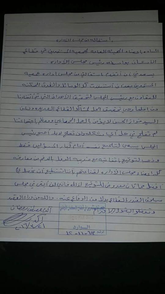 قدم عضو مجلس ادارة جمعية المستثمرين في قطاع الاسكان اكرم رمضان عبر حسابه على الفيس بوك ... ويبدو ان استقالة رمضان عبر الفيس بوك تأتي تعبيرا عن ازمة يعانيها رمضان في الجمعيه وفيما يلي نص الاستقالة