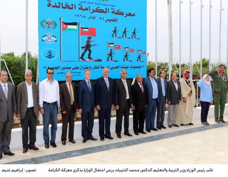 فهد العلوان رعى نائب رئيس الوزراء وزير التربية والتعليم الدكتور محمد الذنيبات احتفال الوزارة بالذكرى الثامنة والأربعين لمعركة الكرامة الخالدة في موقع النصب التذكاري لشهداء معركة الكرامة في لواء الشونة الجنوبية.