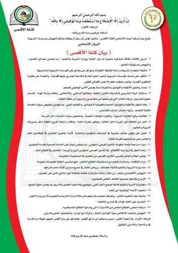 وتطرق البيان الذي اصدرته كتلة الاقصى على 22 بندا يلخص اهم تطلعات وطموح المعلم وضمان حقه وامنه وخارطة عمل متكاملة لتطوير العملية التربوية بشكل عام ويشتمل البيان على: