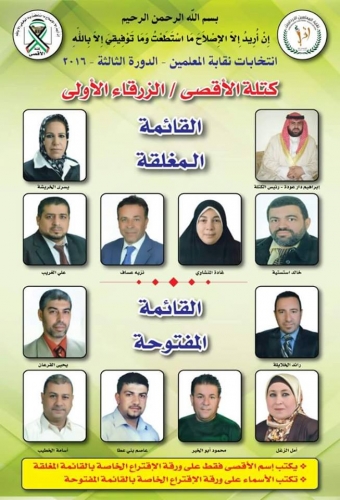 وتحظى كتلة الاقصى بتأييد واسع وثقة كبيرة من الزملاء جعل منها المنافس القادم بقوة من خلال افكار وطروحات بناءة ومتميزة واسماء لها باع طويل في العملية التربوية ومشهود لها بالنزاهة والخبرة والمهنية العالية.
