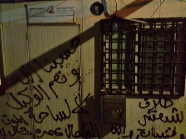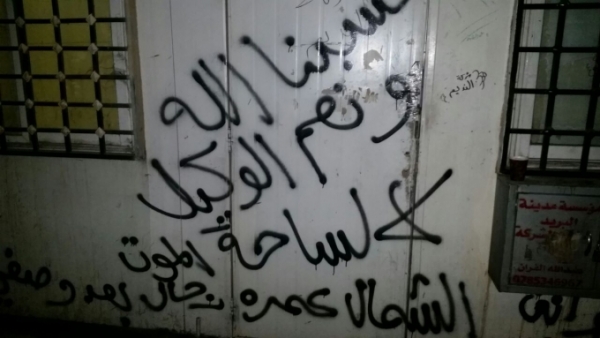 وبلغها بان المساء اليهم سينظمون اعتصاما امام مكتب المحافظ لرد الاعتبار لهم ومحاسبة مرتكبي هذه الاساءة اضافة الى انهم سيوقعون على عريضة يوضحون فيها ما جرى ويطالبون ايضا باتخاذ الاجراءات القانونية ضد من كتب تلك الشعارات التي وصفوها بانها ارهاب لمن يعارض اضرابهم.
