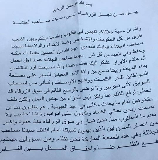 اصدر عدد من تجار محافظة الزرقاء بيانا اسنكاريآ ونداء استغاثة الى جلالة الملك لانقاذهم من اسلوب وطريقة تعامل المسؤولين في ادارتهم لملف البسطات واصفين ارزاقهم المهددة بأنها مغموس بالمهانة والذل ناهيك عن زجهم بالسجون والنظارات بحجة مكافحة البسطات