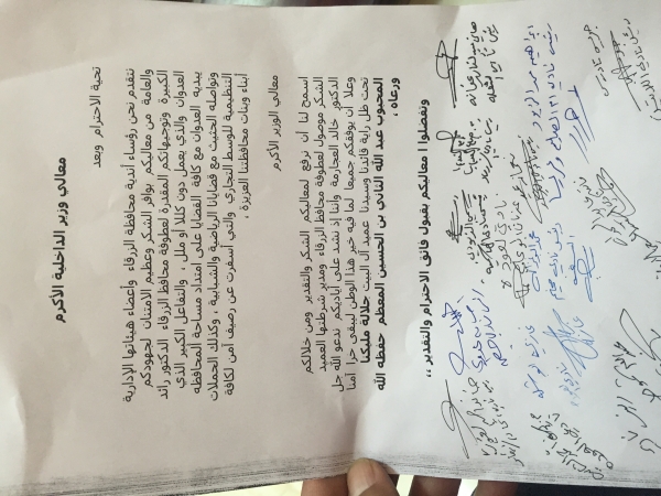 رفعت أندية الزرقاء برقية شكر وتقدير الى معالي وزير الداخلية على الجهود المبذولة في محافظة من قبل الحاكم الاداري د. رائد العدوان وجاء في المذكرة ان محافظ الزرقاء العدوان يعمل دون كلل او ملل وان التفاعل مستمر مع الأندية ونشاطاتهم الرياضية والاجتماعية والشبابية .