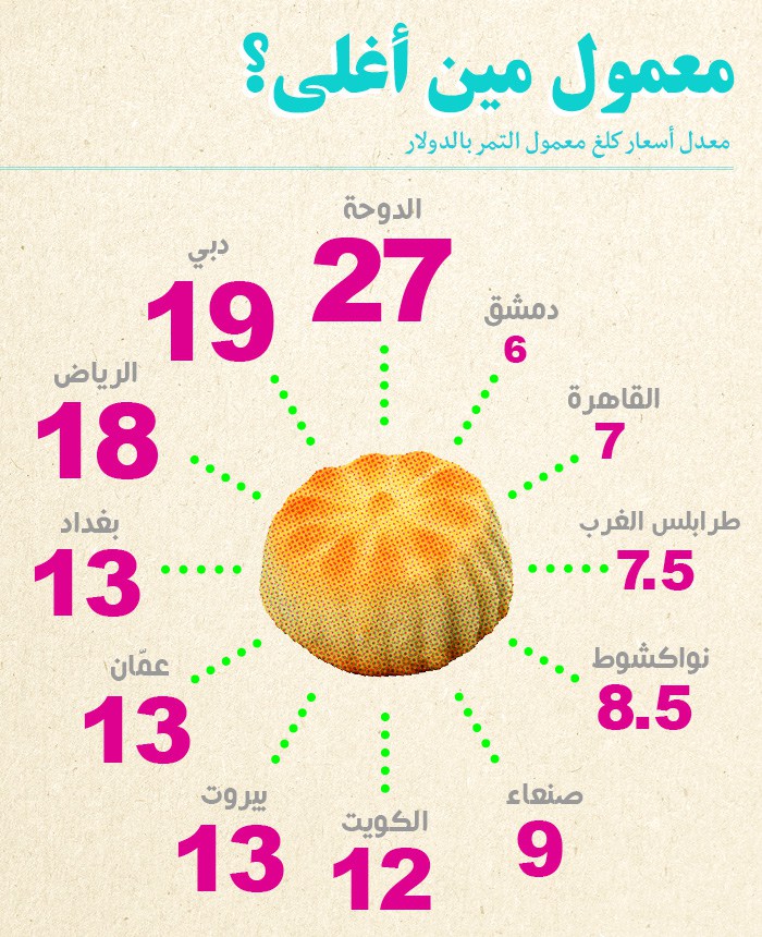 تقليدياً، منذ زمن طويل وحتى اليوم، يعتبر إعداد النساء للمعمول في المنزل في ليلة العيد من عادات العيد. إلا أن تطور المجتمعات والتغيير الذي طرأ على متطلبات الحياة اليومية، دفع البعض إلى شراء المعمول من متاجر الحلويات بدل إعدادها في المنزل. فما هو سعر الكيلوغرام من معمول التمر في بعض الدول العربية؟