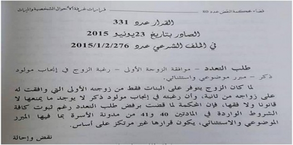 جاء في الخبر أن إحدى محاكم الاستئناف بالمغرب رفضت منح الإذن بالزواج مرة ثانية لرجل رغم موافقة زوجته الأولى، معتبرة الحجة التي تقدم بها لطلب الإذن بالتعدد سخيفة، فتحول الرجل بطلبه مرة ثانية، إلى المجلس الأعلى (محكمة النقض)، وأصدر قاض بغرفة الأحوال الشخصية والميراث بالمجلس قراره بإعادة النظر في الحكم، وعلله بكون رغبة الزوج في إنجاب مولود ذكر يعد مبرراً موضوعياً واستثنائياً.