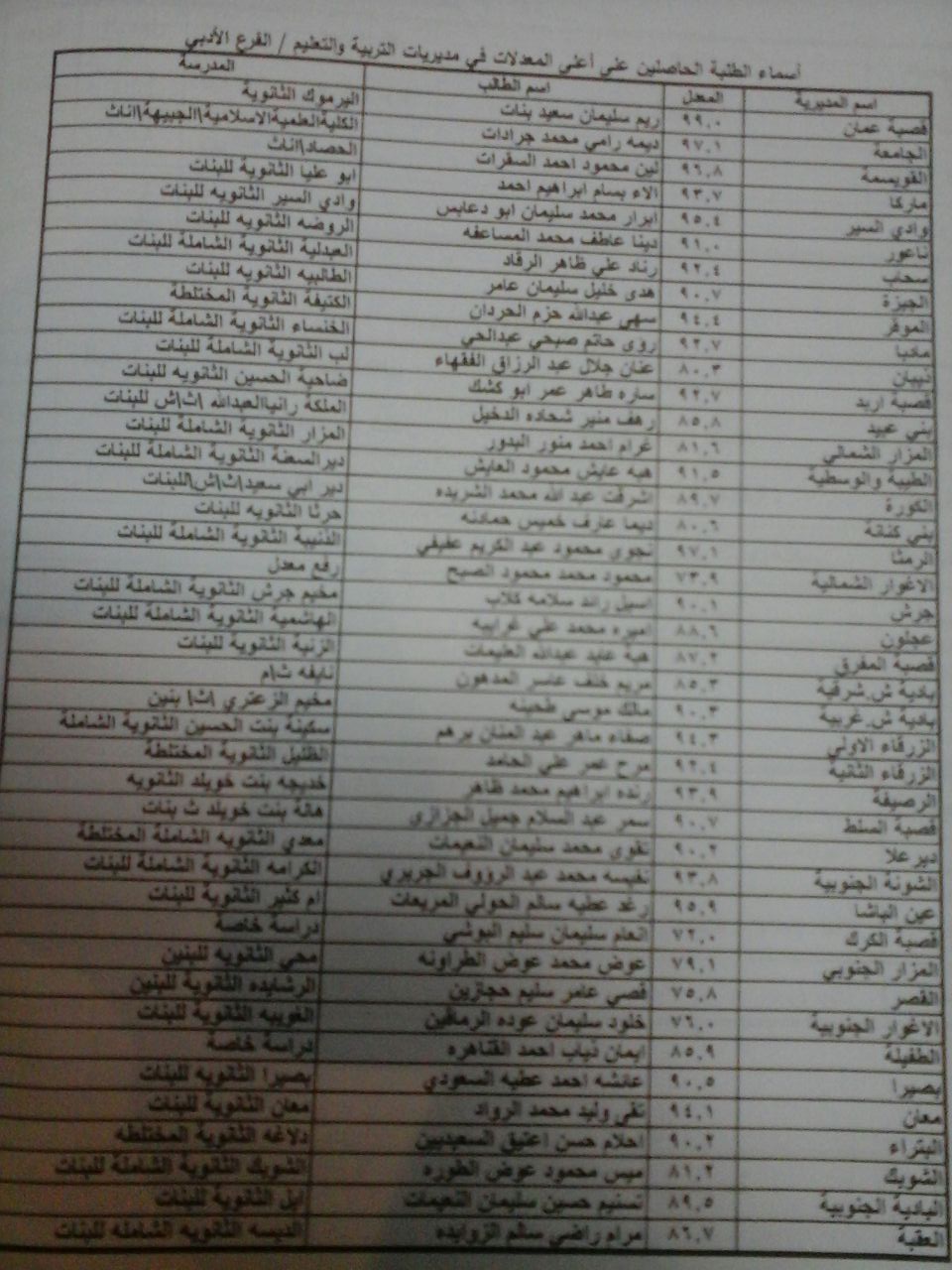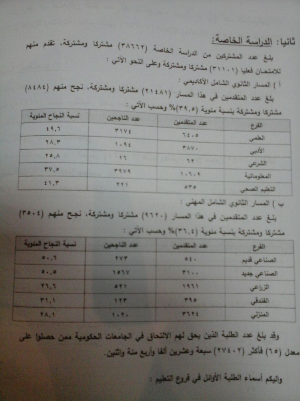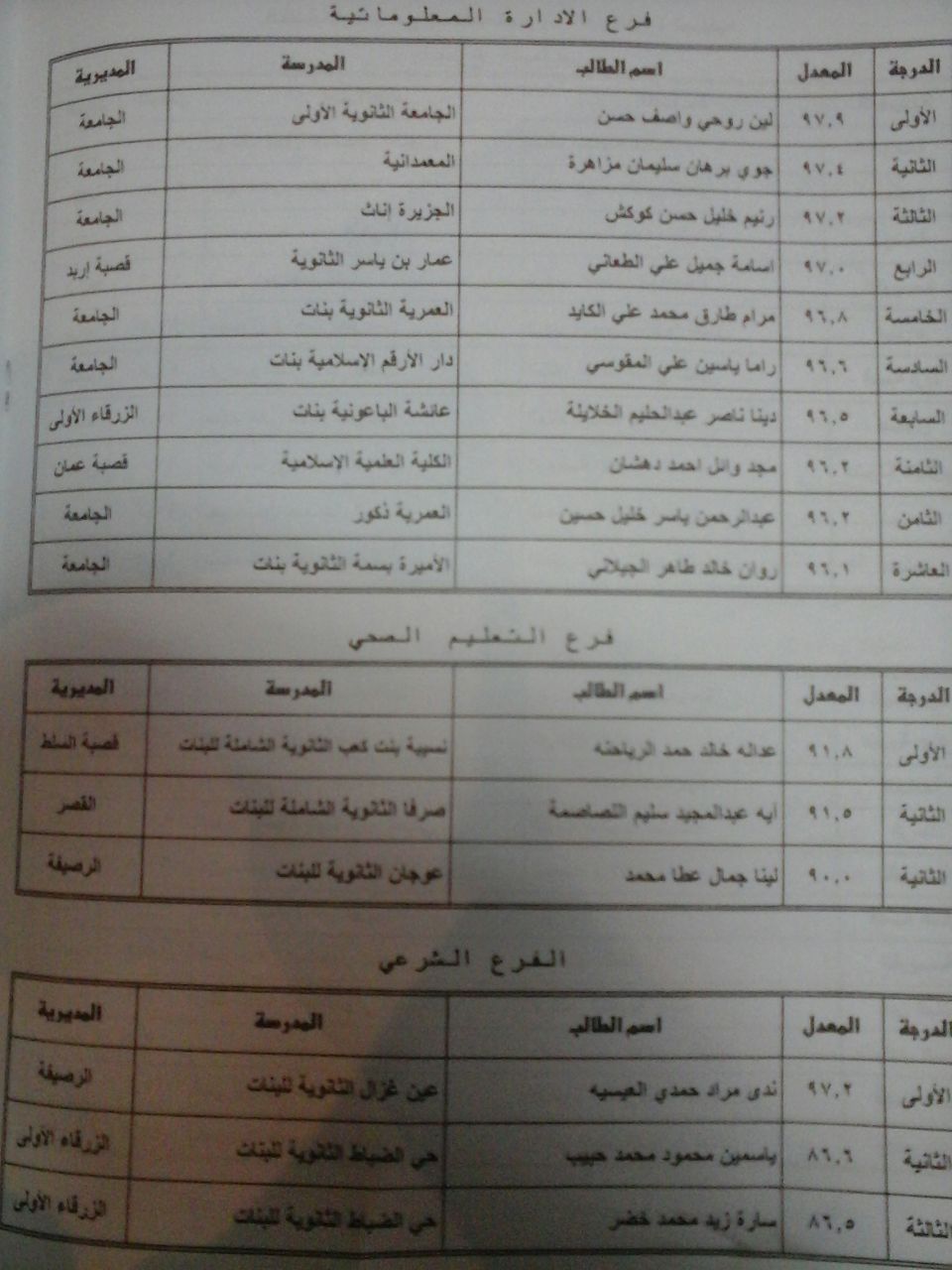 ووفق الذنيبات، بلغت نسبة النجاح العامة 40.1%، (العلمي 63.1% والأدبي 18.2% والشرعي 18.9% المعلوماتية 26.5 والتعليم الصحي 20.4).