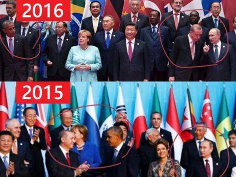 تتوالى القمم وتتغير المواقف، وتبقى الصور أحد الشواهد المؤرخة، وهو لسان حال قمة الـ20 التي احتضنتها الصين في الرابع من الجاري، وسابقتها التي أقيمت بأنطاليا التركية العام الماضي، واللتين شهدتا مواقف وعلاقات تأرجحت بين التوجس والارتياب لزعماء على غرار الرئيس التركي رجب طيب أردوغان والرئيس الأميركي باراك أوباما والرئيس الروسي فلاديمير بوتين.