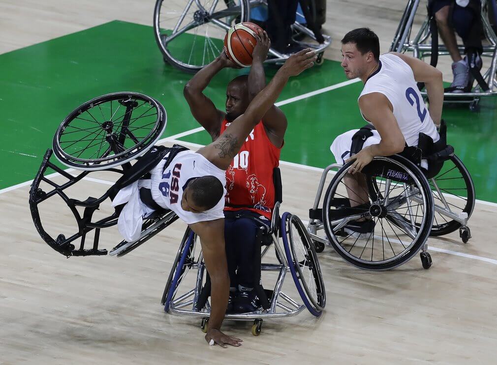 الفريق الأمريكي والبريطاني في لعبة كرة السلة عبر الكراسي المتحركة.