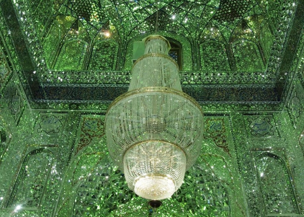 هذا هو مسجد شاه شيراغ، أي ملك الضوء، في مدينة شيراز الإيرانية. يبدو المسجد من الخارج عادياً جداً ومتواضعاً، حتى تدخل إليه فتبهرك الأضواء والرخام الأخضر والتلاعب بالنور والظل من خلال الزينة والزخارف وفتحات النوافذ.