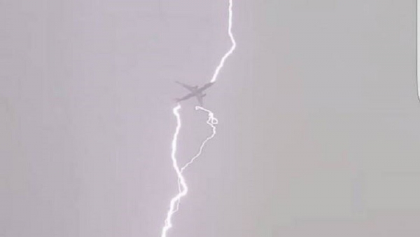 تبين الصورة لحظة مدهشة لصاعقة تضرب طائرة تجارية خلال مرورها بعاصفة رعدية، وقد يكون المشهد في غاية الروعة لمن رآه من الأرض ولكنه سيسبب موجة من الذعر للركاب.