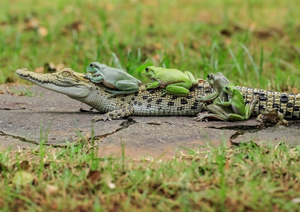 وبحسب " الديلي ميل" فقد قررت خمسة ضفادع مختلفة الألوان بين الأخضر والبني، التسلق على ظهر تمساح أمريكي، واتخاذه وسيلة مواصلات، من دون الخوف من تحول هذه الرحلة السعيدة إلى مأساة حال إذا ما قرر التمساح تحويلها لوجبة طعام نظير ركوبها.