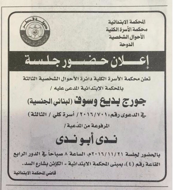 وجاء في نص الدعوى المنشورة تعلن محكمة الأسرة الكلية دائرة الأحوال الشخصية الثالثة بالمحكمة الابتدائية المدعى عليه جورج بديع وسوف (لبناني الجنسية ) في الدعوى رقم 7010 /2016 أسرة كلي الثالثة المرفوعة من المدعية ندى أبو ندى بالحضور لجلسة 21/11/2016 الساعة 8 صباحاً في الدور الرابع ، القاعة رقم (4) بمبنى المحكمة الابتدائية الكائن بشارع السد.. توقيع قاضي المحكمة الابتدائية.