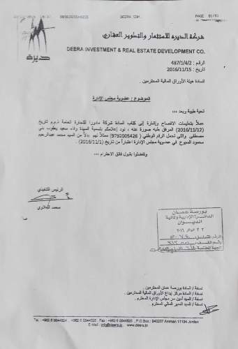 أفصح الرئيس التنفيذي لشركة الديرة للاستثمار والتطوير العقاري بتعين النائب وفاء سعيد بني مصطفى في مجلس الإدارة بدلاً من العضو المستقيل محمد السبوع اعتباراً من تاريخ 1/11 .
