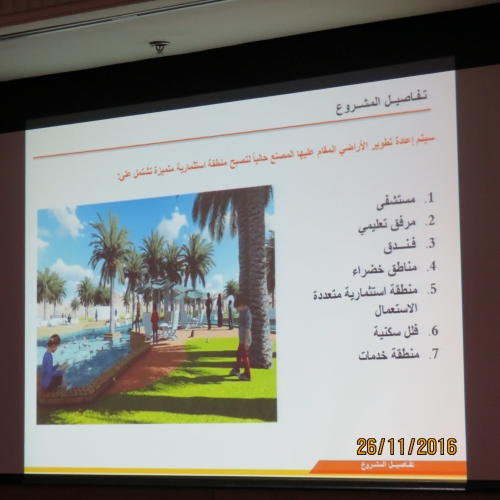 وأضاف ان فكرة المشروع يشمل العديد من المكونات مثل: مستشفى، جامعة، فندق، نادي رياضي، مساحات خضراء ، مطاعم، وعدد محدود من الفلل السكنية. بما سيساهم في توفير العديد من فرص العمل سواء إثناء المشروع أو بعد الانتهاء منه .