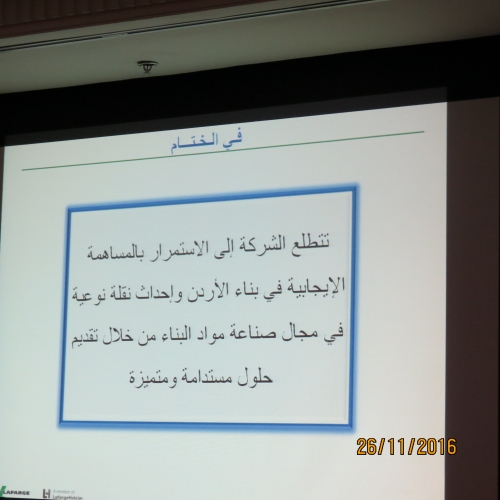 وأكد ان هنالك تنسيق مع البلدية بخصوص هذا المشروع منذ بداية العام الحالي حيث عقدت الشركة مع البلدية وممثلي من المجتمع المحلي ووزارة البلديات أكثر من اجتماع وبحضور المكتب الاستشاري وأنجزت الشركة كافة التصاميم الهيكلية لهذا المشروع الاستثماري، بالتشاور مع بلدية الفحيص التي كان لها ملاحظات فنية حول المخططات التي تقدمت بها لافارج والتي تم الاخذ بها في التصورات النهائية للمخططات الى أن تم توقيع مذكرة تفاهم مع البلدية وممثلين عن المجتمع المحلي في شهر آب الماضي وما زلنا ننتظر موافقة المجلس البلدي على هذه المذكرة.