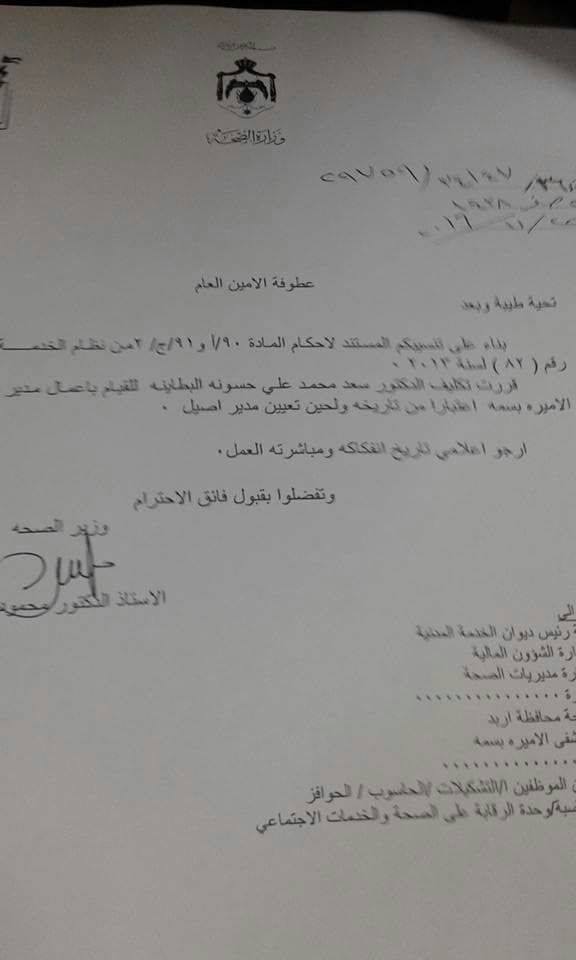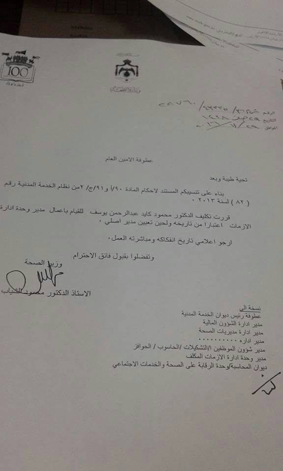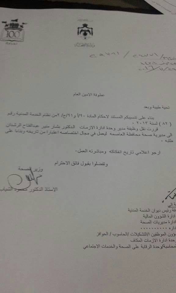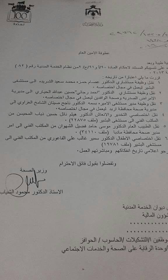 قرر وزير الصحة الدكتور محمود الشياب الموافقة على اجراء تنقلات وتشكيلات ادارية في وزارة الصحة والمستشفيات التابعه لها.