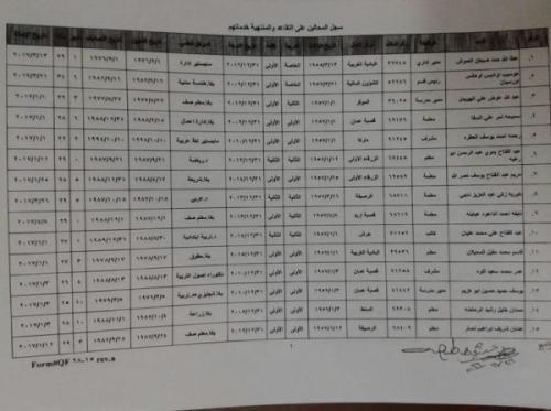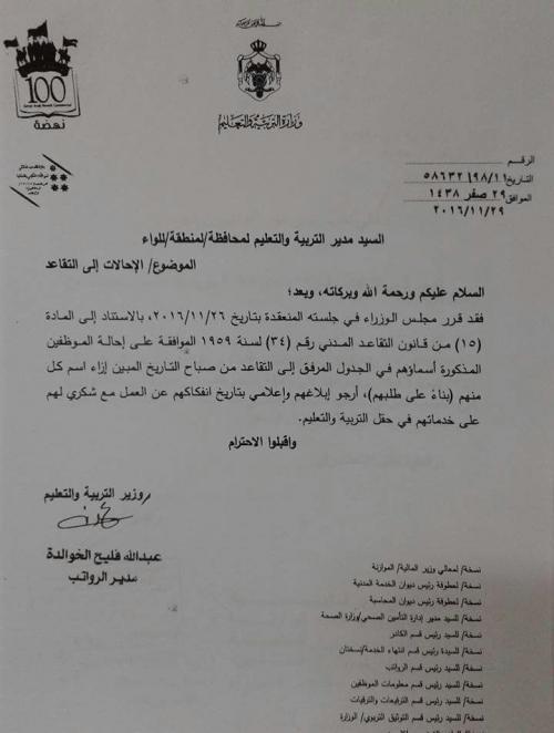 قرر مجلس الوزراء وبناء على تنسيب وزير التربية والتعليم في جلستة المنعقدة بتاريخ 2016/11/26 احالة موظفين في الوزارة الى التقاعد بناء على طلبهم.