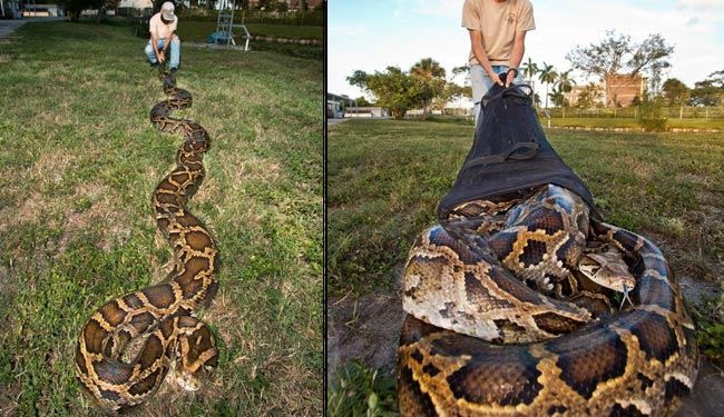 نشرت صحيفة "ديلي ميل" البريطانية صور الأفعي ضخمة عثر عليها مجموعة من خبراء الأحياء البرية في ولاية فلوريدا الأمريكية. والتهمت الأفعي 3 ظباء صغار، عثر عليها الخبراء بداخل بطنها، وتوقعوا أن تكون تناولت الثلاثة ظباء علي مدي 90 يوما. ووصل طول الأفعي إلي حوالي 16 قدما تقريباً، كما يصل وزنها إلي50 كيلو، ويعتمد هذا النوع من الحيوانات علي لف جسدها علي الفريسة حتي تقتلها وتأكلها.