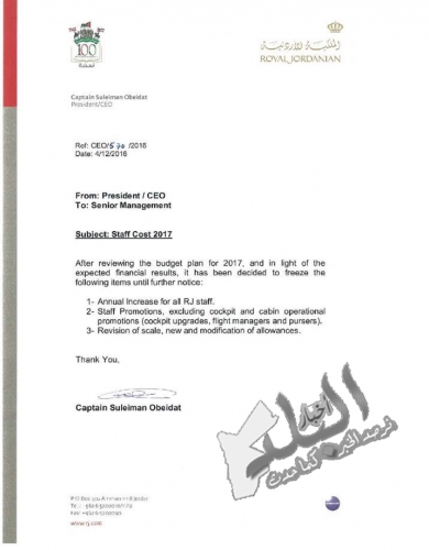 اثار قرار مدير عام الملكية الأردنية سليمان عبيدات وقف الزيادات السنوية والترفيعات في الشركة استياءا كبيرا بين العاملين لا سيما ان القرار استثنى الطيارين والمضيفين الجويين وهي دوائر تتبع لـ نجلة الكابتن غسان عبيدات.