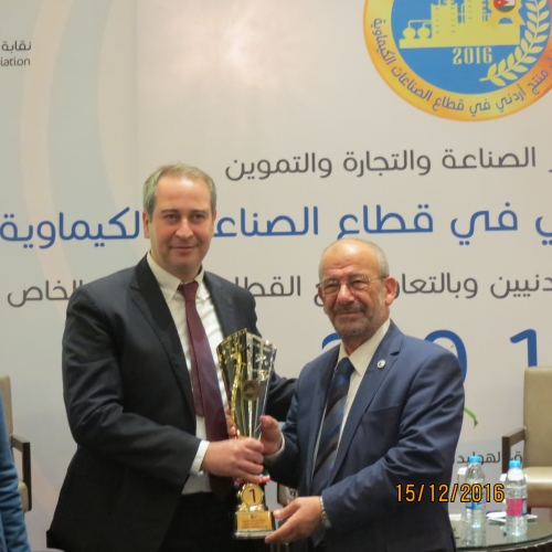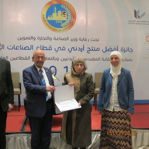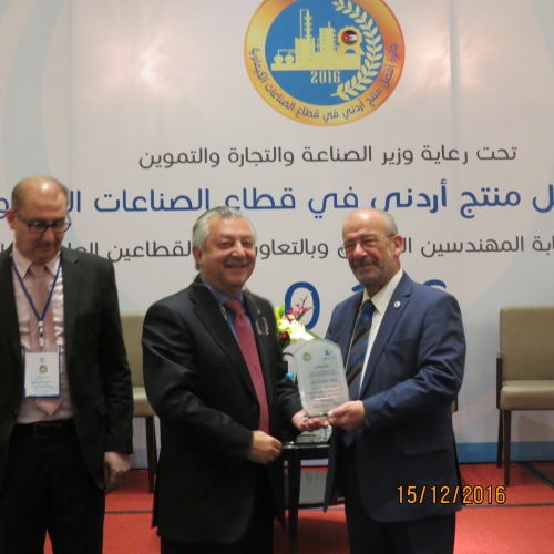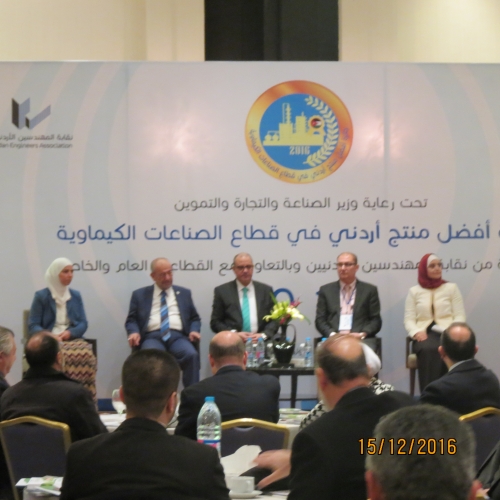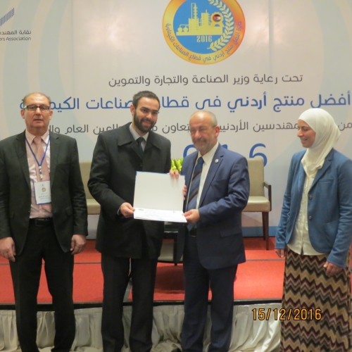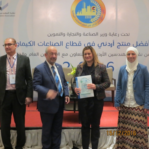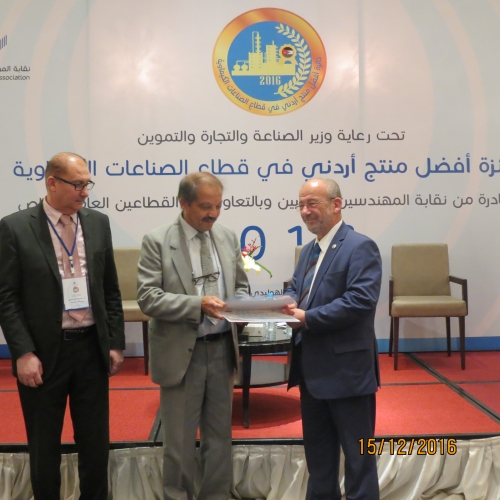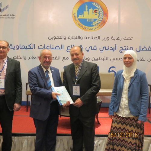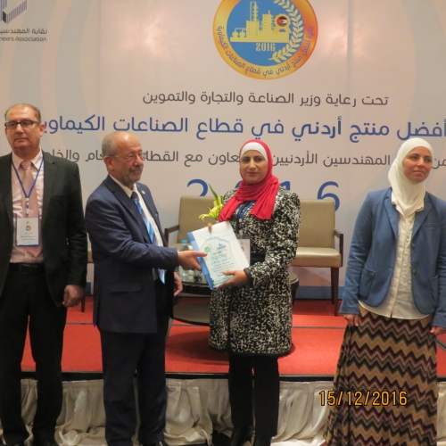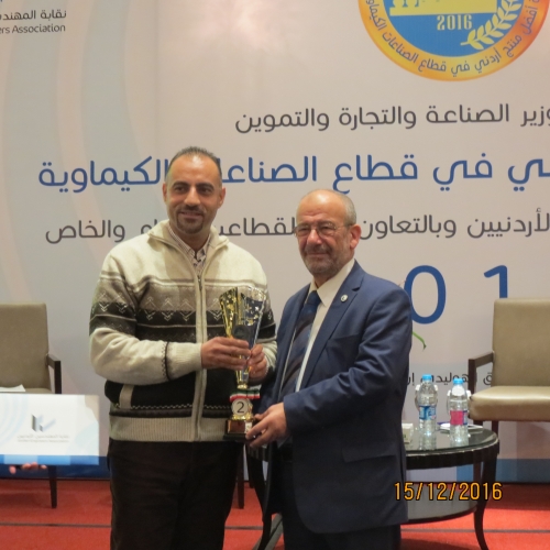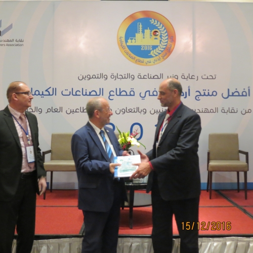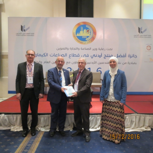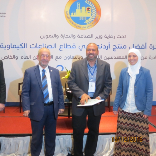 أطلق أمس الخميس 15/12/2016 في فندق الهوليدي آن فعاليات جائزة أفضل منتج أردني في قطاع الصناعات الكيميائية والتي تنظمها شعبة الهندسة الكيميائية في النقابة برعاية وزير الصناعة والتجارة والتموين.