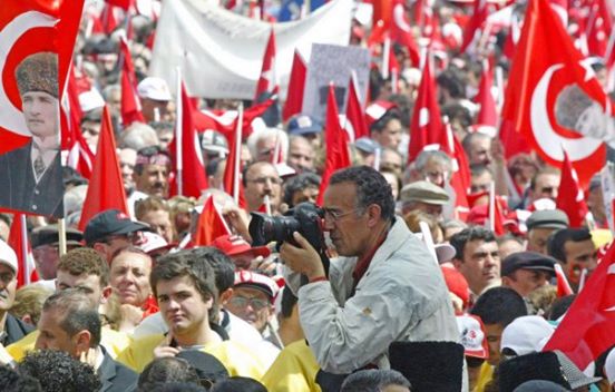 فوسط ساحة الجريمة أبقى بورهان أوزبيليسي، مصور وكالة "أسوشيتد برس" عدسته ثابتة ولو لبرهة من أجل تغطية الأحداث داخل القاعة.