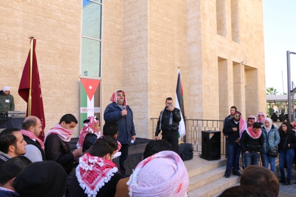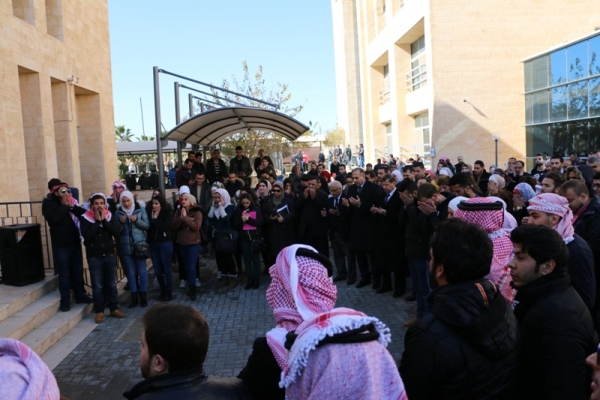 و من جهته ادان عميد شؤون الطلبة الدكتور سليم شريف في كلمته هذه الجريمة الارهابية البشعة التي نفذها مجموعة من الخوارج والارهابيين و أكد بأن الوطن سيبقى قويا في ظل قيادته الهاشمية ممثلة بجلالة الملك عبدالله بن الحسين الثاني وسواعد ابناءه و تضامنهم .