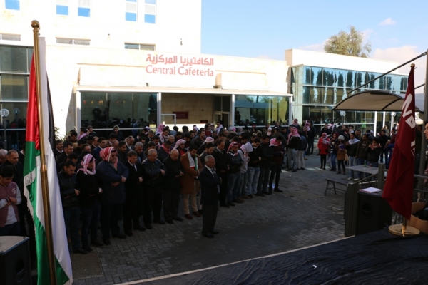 وتضمنت الوقفة التي حضرها القائم باعمال رئيس الجامعة الأستاذ الدكتور محمد الحيلة وعمداء الكليات و عدد من أعضاء الهيئتين التدريسية والإدارية و الطلبة الوقوف دقيقة صمت وقراءة الفاتحة ، و تأدية صلاة الغائب على ارواح الشهداء .
