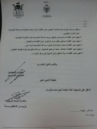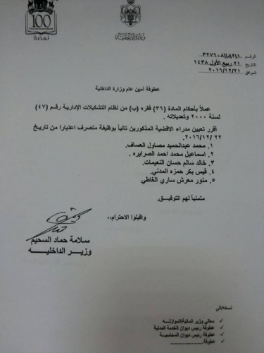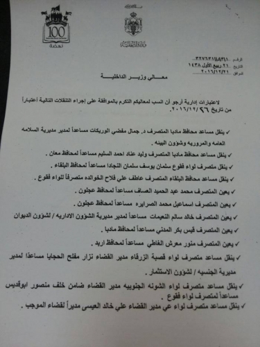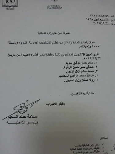 قرر وزير الداخلية، سلامة حماد إجراء تشكيلات إدارية، شملت تنقلات لمتصرفين وتعيينات لمدراء أقضية اعتباراً من تاريخ 26/12/2016.