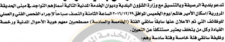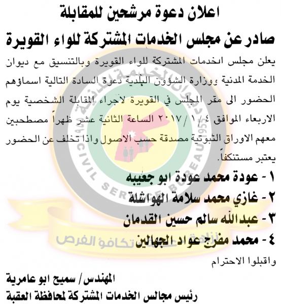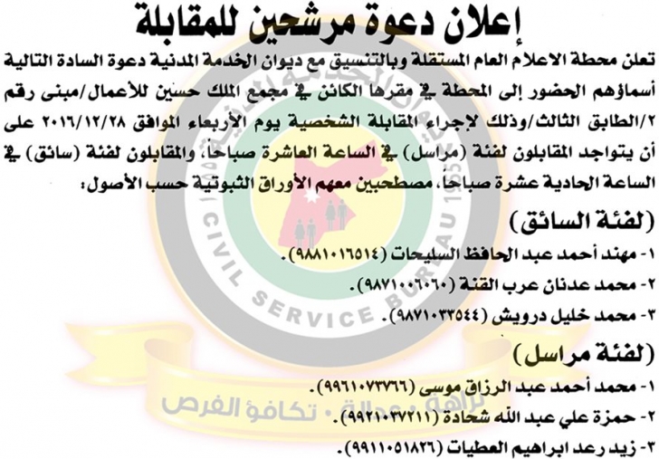 دعا ديوان الخدمة المدنية بالتعاون مع مختلف الوزارات والمؤسسات الحكومية، التالية اسماؤهم لاجراء المقابلات الشخصية وعقد الامتحان التنافسي لغايات التعيين.