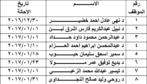 وافق مجلس الوزراء على إحالة موظفين في وزارة التربية ووزارة الصحة ومختلف الوزارات والمؤسسات الحكومية على التقاعد، اعتبارا من التاريخ المبين إزاء اسم كلّ منهم.