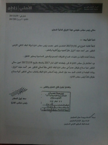 قرر مجلس ادارة البنك الاهلي الاردني انتخاب سعد نبيل المعشر رئيساً لمجلس ادارة البنك خلفاً للدكتور عمر الرزاز الرئيس السابق الذي جرى تعينه في التعديل الوزاري الاخير بمنصب وزير التربية والتعليم.