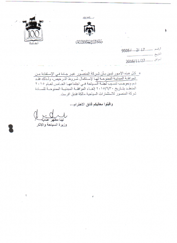 علمت شركتنا (شركة إفرست لإدارة الأجنحة الفندقية) خلال زيارة مندوب الشركة إلى وزارة السياحة والآثار الموقرة في بداية شهر حزيران (6) من العام 2015 بأنه قد صدر قرار من الوزارة بإغلاق مبنى إفرست السياحي بسبب انتهاء الموافقة المبدئية الممنوحة للمبنى والصادرة بإسم الشركة مالكة المبنى (شركة المنصور للإستثمارات المتعددة) والتي يملكها عراقيون وذلك بسبب رفض شركة المنصور الإلتزام بتنفيذ متطلبات الموافقة المبدئية المذكورة بقصد أن يتسببوا بإغلاق المبنى تمهيداً لبيعه ، وبناءً عليه قامت شركتنا شركة إفرست وبصفتها المستثمر والمشغل الفعلي للمبنى بمراجعة أمين عام وزارة السياحة وأوضحت له كافة التفاصيلالمتعلقة بالموافقة المبدئية ، وبأن هناك قضية تحكيمية منظورة بين شركتنا وشركة المنصور ولا علاقة لوزارة السياحة بهذه القضية لا من قريب ولا من بعيد وأننا ننأى بوزارة السياحة الموقرة أن تُقحمُ نفسها بين متخاصمين وتقف بغير حياد مع طرف ضد الطرف الثاني!!!، ولأننا لا نرى سوى القانون حَكماً بيننا كمواطنين ، ولا نرى سوى الدستور فيصلاً في النزاعات، فلسنا أهل بلطجة ولا أهل فساد ،إلا أن شركتنا شركة إفرست لم تصل إلى أي نتيجة إيجابية معه (وهنا لا يفوتني أن أذكر بأن أمين عام الوزارة ركز وبشدة لمعرفة من أبلغ شركتنا بقرار الإغلاق الذي صدر مسبقاً وأصبحت المشكلة لديه من أبلغنا بالقرار !!!!، ولم يعطي الأمين العام أي اهتمام الى القرار نفسه وعواقبه وتبعاته في حال إغلاق مبنى إفرست والذي سيتشرد بسببه عائلات أردنية لا ذنب اقترفته ، بالإضافة إلى الخسائر الفادحة التي ســيتــسبب بها هذا القرار للشـــركة الأردنية ، وأصبحـت القضـية لديه كيف علمنا بالقرار ومن أعلمنا به ؟ ( درء المفاسد أولى من جلب المصالح يا عطوفة الأمين العام )وهنا تأكدنا أن النية المبيتة كانت مفاجأتنا بإغلاق المبنى وينتهي معهم الأمر على ذلك !!!!) ومن باب حسن النية بالنظر إلى موقف أمين عام الوزارة نعتقد أن السبب في ذلك كان بأن أحد المسؤولين وبرفقة العراقيين قاموا بزيارته مسبقاً حسب ما علمنا من الأمين العام للوزراة ومعهم محامي العراقيين، ويبدو لنا أنهم قاموا بإقناعه بطريقة أو بأخرى بضرورة إصدار قرار الإغلاق وتنفيذه على المبنى بالسرعة القصوى!!!( وكأن شركة افرست المستثمرة والمشغلة الفعلية للمبنى هي وموظفيها خلايا سرطانية يجب إزالتها والتخلص منها فوراً!!!!! )