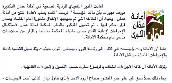 نود بدايةً التعليق على رد أمانة عمان على الحلقة الأولى والتي تم نشرها من طرفنا بتاريخ 22/1/2017 حيث صرحت مديرة الرقابة الصحية بتاريخ 23/1/2017 أن إغلاق إفرست جاء بقرار من المحكمة ، وهذا التصريح الصادر عن مديرة دائرة الرقابة الصحية في أمانة عمان هو افتراء بحت وعار عن الصحة تماماً ويُقصد به التضليل الفاضح ، والحقيقة المؤكـــدة ومــــن واقع المســــتندات والوثائق أنه تم إغلاق مبنى إفرست تحفظياً ( احترازياً ) من قبل دائرة الرقابة الصحية بتاريخ 13/2/2016 بواقع ضبط إغلاق المؤرخ 13/2/2016 ويحمل توقيع إدارة شركة إفرست عليه حسب الأصول وتم إغلاق مبنى إفرست كاملاً بالإستناد إلى ضبط الإتلاف المؤرخ 9/2/2016 فقط ويحمل كذلك توقيع إدارة شركة إفرست عليه حسب الأصول ، ولم يتم التطرق نهائياً لوجود و/أو سريان ترخيص مهني للمبنى من عدمه . وتم أيضاً تحديد موعد جلسة بمحكمة أمانة عمان لتاريخ 9/3/2016 من واقع مذكرة تبليغ مختصة بالمشتكى عليه صادرة من محكمة أمانة عمان الكبرى بتاريخ 9/2/2016 وتحمل الرقم 638633 وتحمل كذلك توقيع إدارة شركة إفرست عليه حسب الأصول ، ولم يتم تحرير أي تقرير مخالفة نهائياً داخل مبنى إفرست بناءً على ضبط الإتلاف المذكور أعلاه ، وفي صباح اليوم التالي للإغلاق مباشرة بتاريخ 14/2/2016 تم من طرفنا إحضار كف طلب من محكمة أمانة عمان حسب الأصول إلا أن مديرة دائرة الرقابة الصحية وبصفتها فوق القانون رفضت الإمتثال نهائيا ًإلى أمر المحكمة بكف الطلب وفك الشمع وإعادة فتح المبنى ، وقالت وبحضور زميل لها بالأمانة أنه لو أحضرتم كف طلب من الديوان الملكي فلن أزيل الشمع الأحمر إلا بإشعار أو رسالة نصية من عقل بلتاجي شخصيا تفيدني بإزالة الشمع الأحمر وأن مشكلتكم ليست معي وإنما مع عقل بلتاجي شخصياً ، وبقي هكذا مبنى إفرست مغلقاً بشكل مخالف للقانون . وإنه لشيء مخجل جداً أن يصدر وعلى الملأ رد صحفي عن بعض مدراء دوائر الأمانة مغايراً للحقيقة وللواقع وللمستندات !!!!!