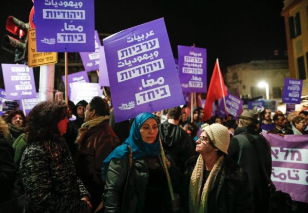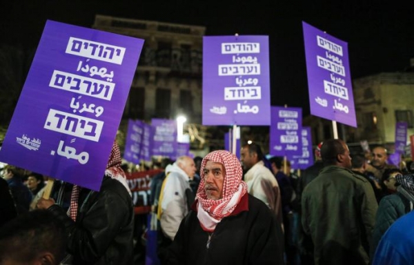 وأفاد مراسل وكالة فرانس برس بأن حوالى الف شخص شاركوا في التظاهرين رافعين لافتات كتب عليها بالعربية والعبرية 'يهودا وعربا معا'، و'نجابه الفاشية' و'نقاوم الاحتلال' و'مساواة' و'مكان للجميع'.