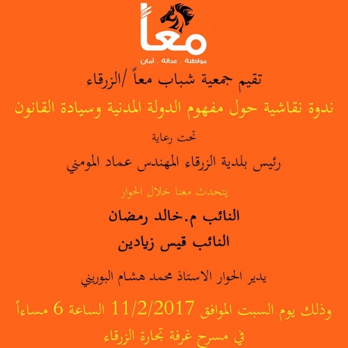 وذلك يوم السبت الموافق 11/2/2017 الساعة السادسة مساء في مسرح غرفة تجارة الزرقاء