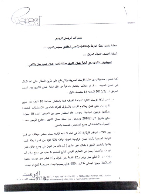 وحيث أن الإغلاق الذي تم بيوم 13/2/2016 هو إغلاق تحفظي فقط طبقاً للقانون ولحين إحضار كف طلب من محكمة الأمانة ، قام في اليوم التالي مباشرةً يوم الأحد الموافق 14/2/2016 مندوب شركتنا بمراجعة مدعي عام محكمة أمانة عمان الكبرى وحصل على كف طلب حسب القانون وذلك لغايات الترخيص موجه إلى الرقابه الصحية بالأمانة ( وتم كتابة لغايات الترخيص من قبل محكمة الأمانة ليس بسبب عدم وجود ترخيص للمبنى أيها السادة وإنما بسبب الدَّس بين أسطر تقرير المخالفة الذي تفاجأنا بوجوده لدى عطوفة المتصرف الأكرم ولدى محكمة الأمانة ، وهذا التقرير المشبوه لا يحمل توقيع إدارة إفرست ، مما يثبت أنه قد تم تحريره خارج مبنى إفرست والذي ذكرت به الرقابة دَّساً وتضليلاً أن مبنى إفرست غير مرخص) .وبناءً عليه قام مدير عام شركتنا آنذاك بالإجتماع مع مديرة دائرة الرقابة بالأمانة وكان ذلك صدفةً بمكتب زميل لها ، وبحضوره قام المدير العام للشركة آنذاك بعرض كف الطلبلأجل أن تقوم مديرة الرقابة بالإيعاز لمن يلزم لإعادة فتح المبنى وإزالة الشمع الأحمر حسب القانون فكان جوابها مباشره " أنكم لو أحضرتم كف طلب من الديوان الملكي لن أقوم بفك الشمع الأحمر ولا بفتح المبنى إلا بإشعار من عقل بلتاجي شخصيا ً"وأفادت المدير العام أيضاً " بأن مشكلتكم ليست معي وإنما مشكلتكم مع عقل بلتاجي شخصياً فلاقيلك حل معه ".