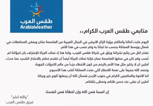 وقال طقس العرب" نعتذر لكل من يتابع نشراتنا ويثق في شركة طقس العرب وإننا هنا اذ نملك الجرأة للإعتراف بان تنبواتنا لم تصب ولم تكن في محلها للعاصمة عمان فإننا نملك الجرأة ايضا أن نتقدم منكم بالاعتذار الشديد عما حدث آملين أمن لا يتكرر مثل هذا الأمر بالرغم من كون الأخطاء جزءا من عالم التنبؤات الجوية.