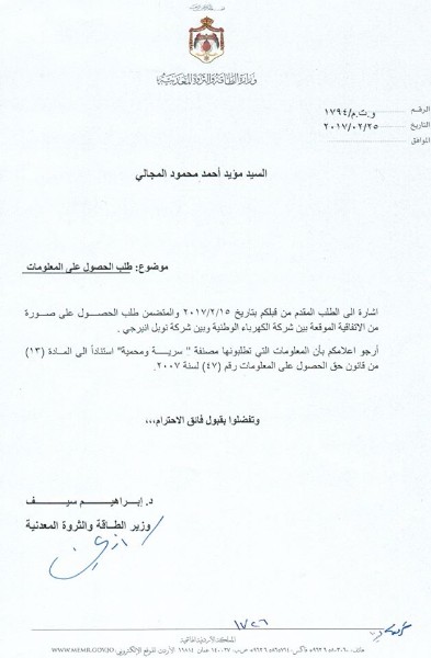 وقد جاء هذا الرفض بعد الطلب الذي قدمه مؤيد المجالي الباحث القانوني في مركز إحقاق للدراسات القانونية لوزير الطاقة بالاستناد لأحكام المادة (17) من الدستور وبالاستناد لأحكام قانون ضمان حق الحصول على المعلومات من أجل تزويده بصورة مطبوعة ورقياً أو إلكترونياً عن الاتفاقية الموقعة بين شركة الكهرباء الوطنية (المملوكة بالكامل للحكومة الأردنية) والضامنة لها وبين شركة نوبل إنيرجي التي تزود شركة الكهرباء الوطنية بالغاز، وذلك من اجل إجراء دراسة قانونية على هذه الاتفاقية وما تضمنتها من أحكام ملزمة لأطرافها خصوصاً الالتزامات المترتبة على الحكومة الأردنية فيها باعتبارها ضامنة وكفيلة لشركة الكهرباء الوطنية (المملوكة بالكامل للحكومة الأردنية) والتي يعتبر مجلس الوزراء الهيئة العامة لهذه الشركة.