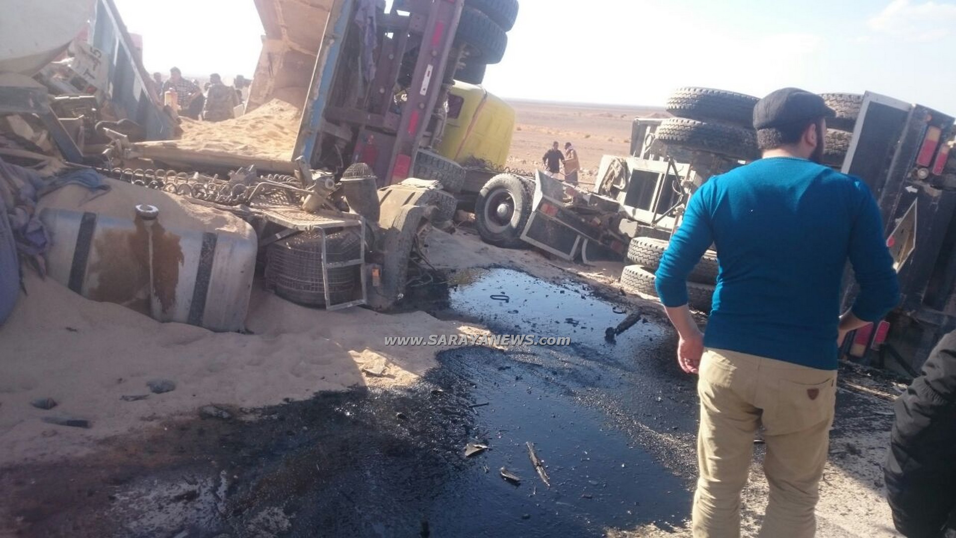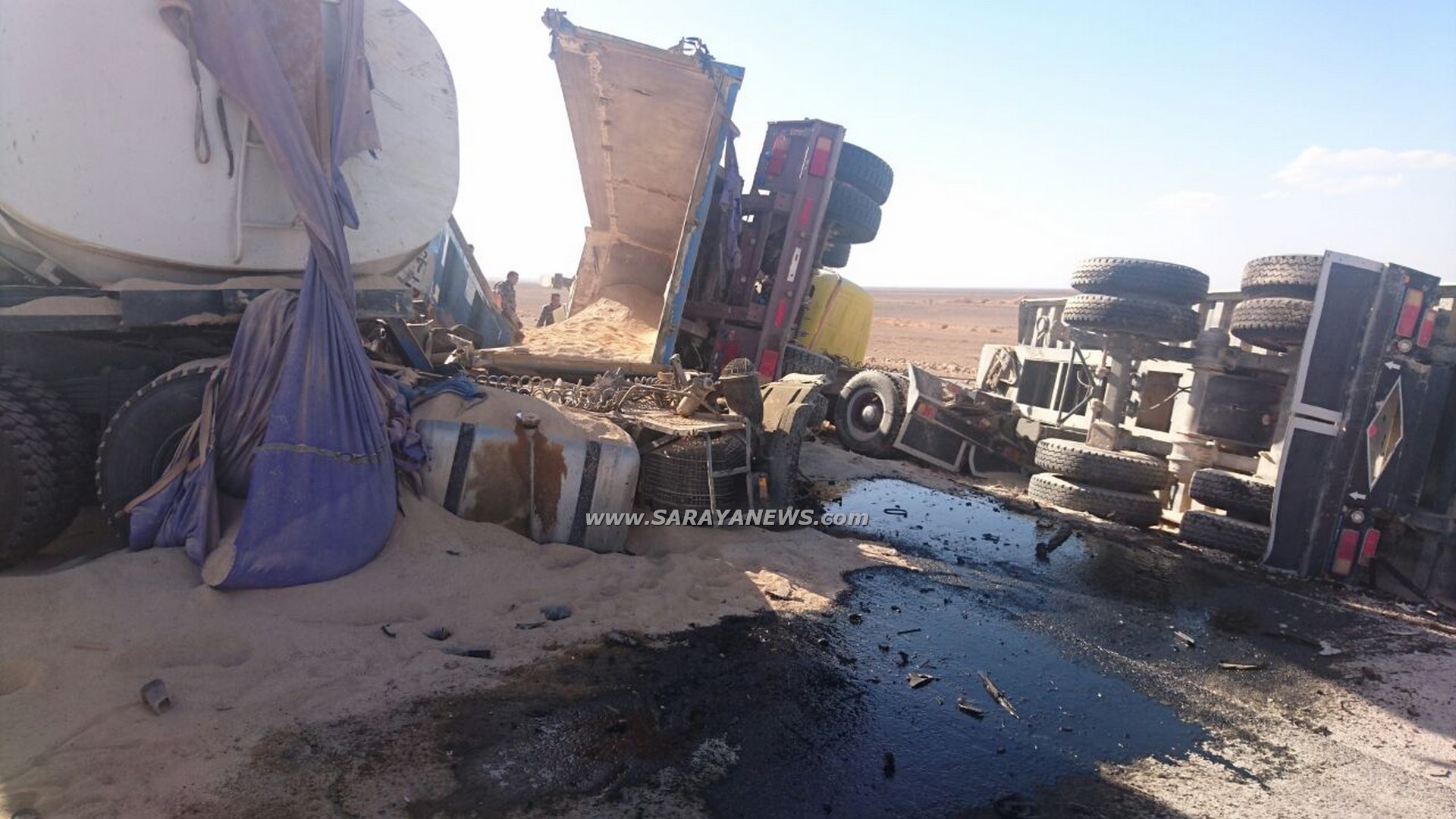وقال مصدر ان حادث اصطدام بين 4 من الشاحنات اسفر عن اصابة مجموعة من الاشخاص بالاضافة إلى الازدحام المروري .