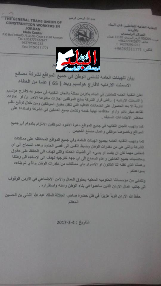 "تعلن النقابة العامة للعاملين في البناء بالأردن ممثلة باللجان النقابية في مجموعة لافارج هوليسم (الاسمنت الأردنية) رفض قرار الشركة بمنح الموظفين إجازات مدفوعة الأجر و/أو إجازات إدارية إلا بعد الحصول على الضمانات الكافية التي تكفل حقوق الموظفين ومن خلال توقيع نظام تقاعد مبكر دائم و/أو مكافأة نهاية خدمة وتشمل جميع العاملين في الشركة واستنادا على محاضر الاجتماعات السابقة.