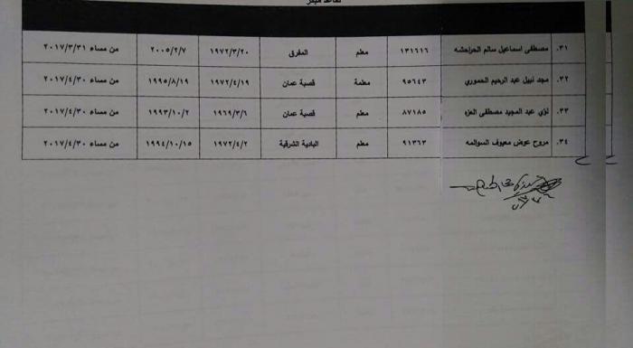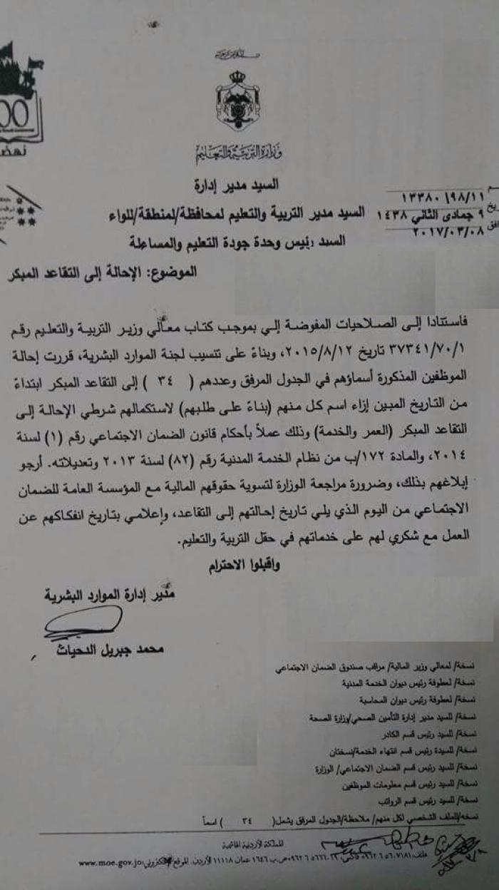 قررت وزارة التربية والتعليم وبناء على تنسيب لجنة الموارد البشرية إحالة ( 34 ) موظف الى التقاعد بناء على طلبهم ولاستكمالهم شرطي الاحالة الى التقاعد المبكر.