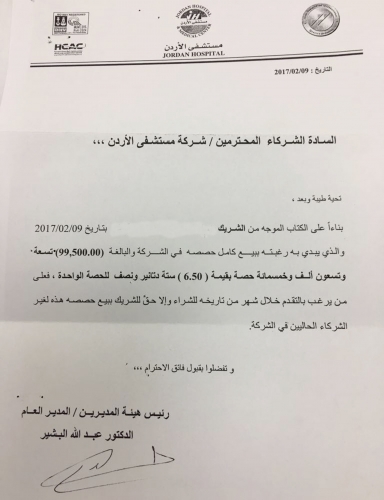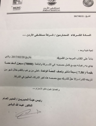 علمت أخبار البلد بأن رئيس هيئة المديرين / المدير العام في مستشفى الأردن الدكتور عبدالله البشير قد وجه تعميم إلى الشركاء بالمستشفى يعلن من خلاله عن نية بعض الشركاء لبيع حصصهم في الشركة والتي تبلغ أكثر من 170 ألف سهم لشريكين اثنين بمبلغ ما بين 6.5 دنانير إلى 7.5 دنانير للسهم الواحد عارضا على من يرغب بالشراء ان يتقدم بالشراء خلال شهر من تاريخ العرض .