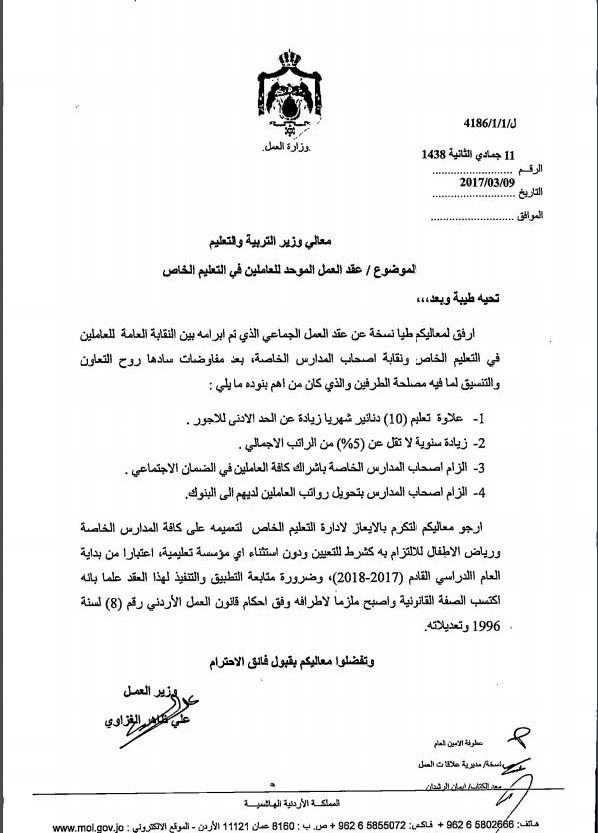وقعت وزارة العمل ونقابتي اصحاب المدارس الخاصة والعاملين في التعليم الخاص مذكرة تفاهم بهدف ترسيخ مبدأ العمل اللائق والمناسب للمعلمين في المدارس الخاصة سيما أن الأردن كان أول دولة عربية توقع اتفاقية مع منظمة العمل الدولية في عام 2006، لتنفيذ برنامج وطني للعمل اللائق استمر العمل به حتى عام 2009، واتبعه ببرنامج آخر شكل مرحلة ثانية للبرنامج الأول، تحت عنوان "البرنامج الوطني للعمل اللائق" في عام 2012، الذي انتهى العمل به في نهاية العام 2015 وتم توقيع اتفاقية العمل الجماعي الجديدة والتي ينبثق عنها العقد الموحد للعاملين في المدارس الخاصة.