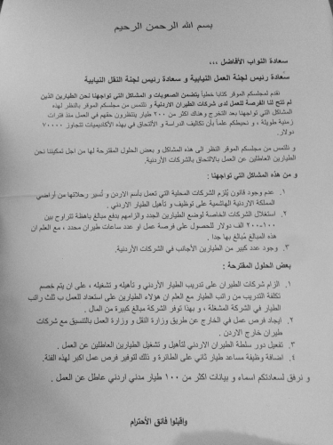 وطالب الكتاب الموقع من عدد كبير من الطيارين الأردنيين
