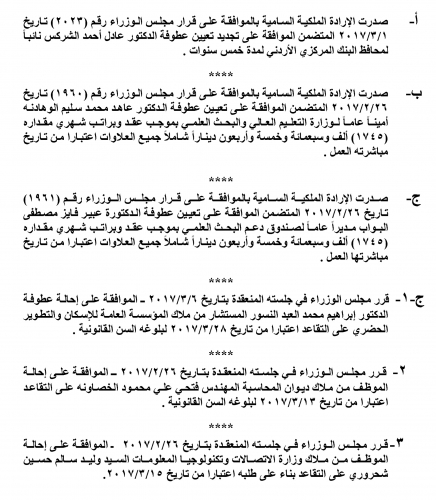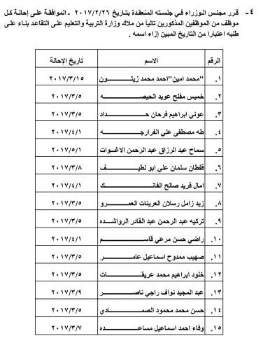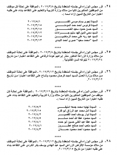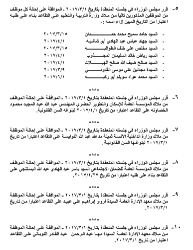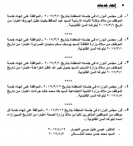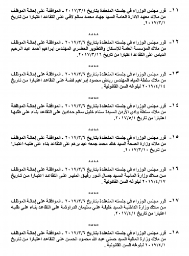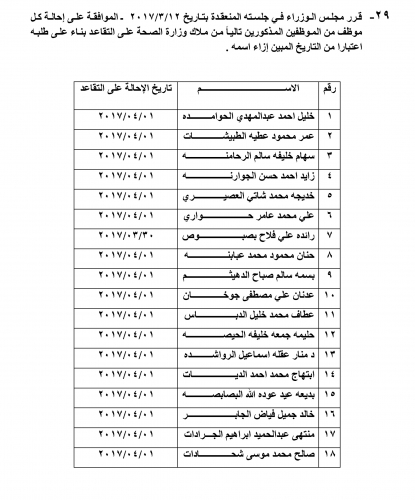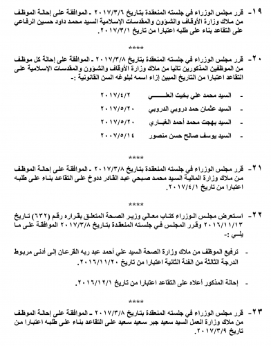 قرر مجلس الوزراء الموافقة على احالة عدد من الموظفين في عدد من الوزارات والدوائر الرسمية الى التقاعد.