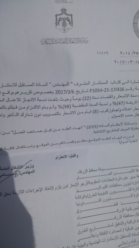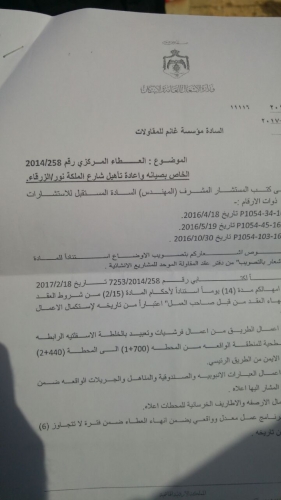 وكان عقد وزارة الأشغال العامة والإسكان،بخصوص شارع الملكة نور في محافظة الزرقاء "شارع المصفاة"يشمل على ،صيانة وتأهيل الطريق و تعبيده بالخلطة الاسفلتية الرابطة للمنطقة، وتنفيذ اعمال العبارات الانبوبيه والصندوقية والمناهل الواقعه ضمن ذات المنطقه،وأعمال الارصفه والاطاريف الخرسانية للمحطات،بحسب مصدر في الوزارة