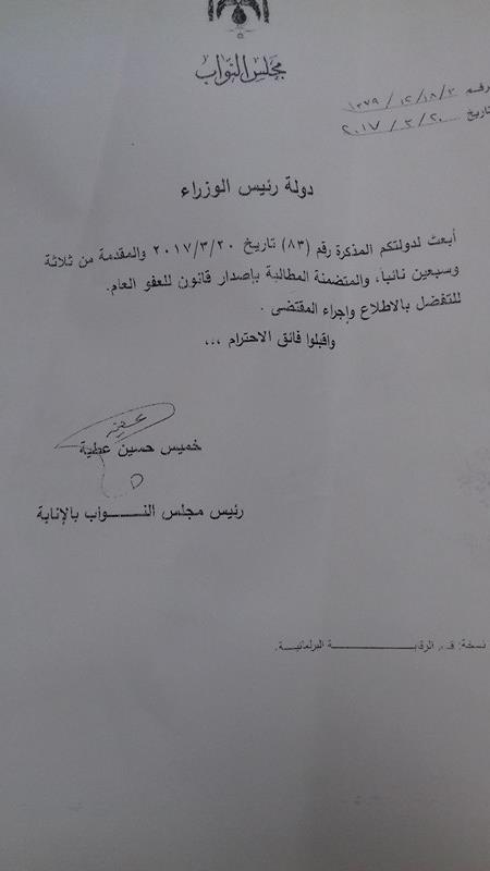 وطالبوا بإضافة مقترح قانون للعفو العام ،مؤكدين ضرورة اصدار هكذا قانون، كون أن آخر قانون للعفو العام كان عام 2011 ،بحسب الكتاب الذي تلقت "أخبار البلد" نسخة منه .