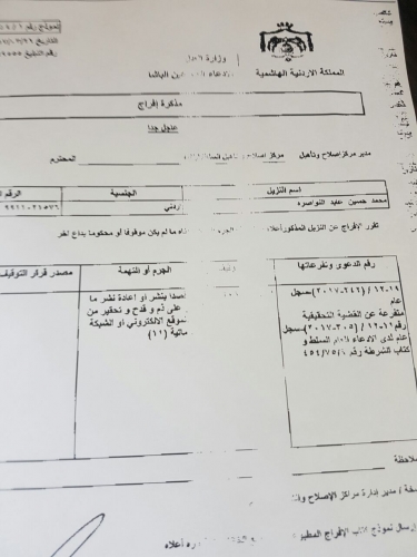 وأضاف "عنزاوي" لـ أخبار البلد،أن المدعي العام أصدر قراراً بالافراج عنه وأخلاء سبيله،ليصار الى تحويله للحاكم الاداري فيما بعد لإتخاذ المقتضى القانوني بحقه